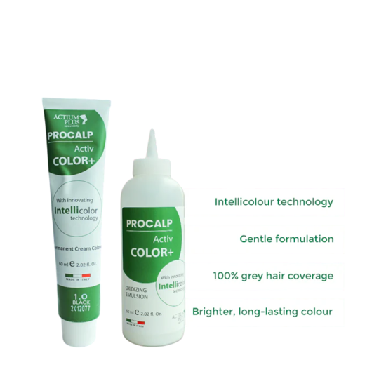 Transform your hair with Actium Plus Procalp Activ Color, a dermatologist-tested, gentle permanent coloring kit crafted for deep nourishment, vibrant color payoff, and superior grey coverage. Formulated with advanced actives like Hydrolyzed Keratin, Sodium Hyaluronate, Arginine HCl, and Wheat & Soya Amino Acids, this hair color system not only delivers rich black color (1.0) but also strengthens, hydrates, and smoothens each strand.