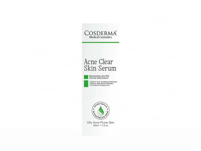 Say goodbye to persistent acne, excess oil, and stubborn post-acne marks with Cosderma Acne Clear Skin Serum, a dermatologist-trusted formulation designed specifically for oily, acne-prone, and sensitive skin. Powered with Niacinamide 12%, Zinc PCA, Tea Tree, Witch Hazel, and soothing botanical extracts, this lightweight, non-comedogenic serum helps reduce breakouts, calm inflammation, and visibly improve skin clarity — without dryness or irritation.