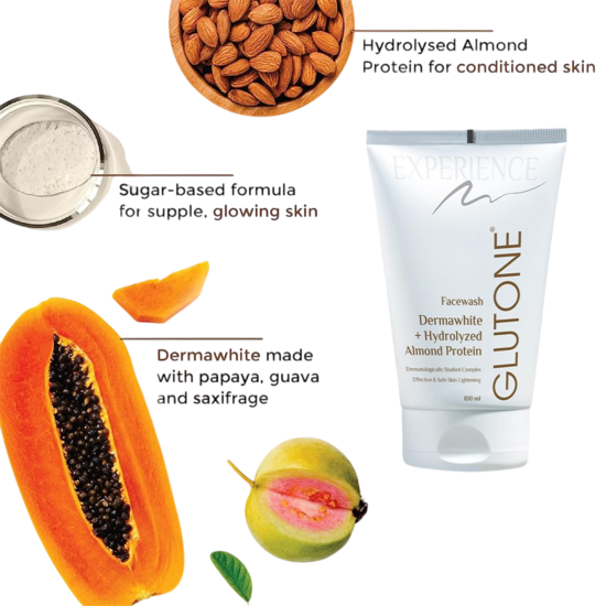 Powered by Dermawhite® — a clinically researched blend of Saxifraga, Papaya, and Guava extracts — along with Hydrolyzed Almond Protein, Glutone Face Wash helps inhibit excess melanin, reduce dullness, and restore natural glow with every wash. The sugar-based surfactant system ensures a soft, non-drying cleanse that suits all skin types, including sensitive skin.