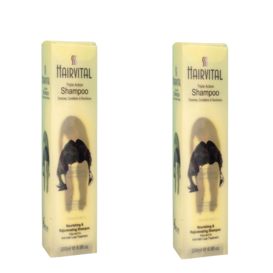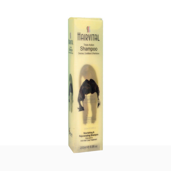 Give your hair the ultimate care it deserves with Hairvital Triple Action Shampoo, a dermatologist-recommended formula designed to cleanse, condition, and strengthen in one easy step.